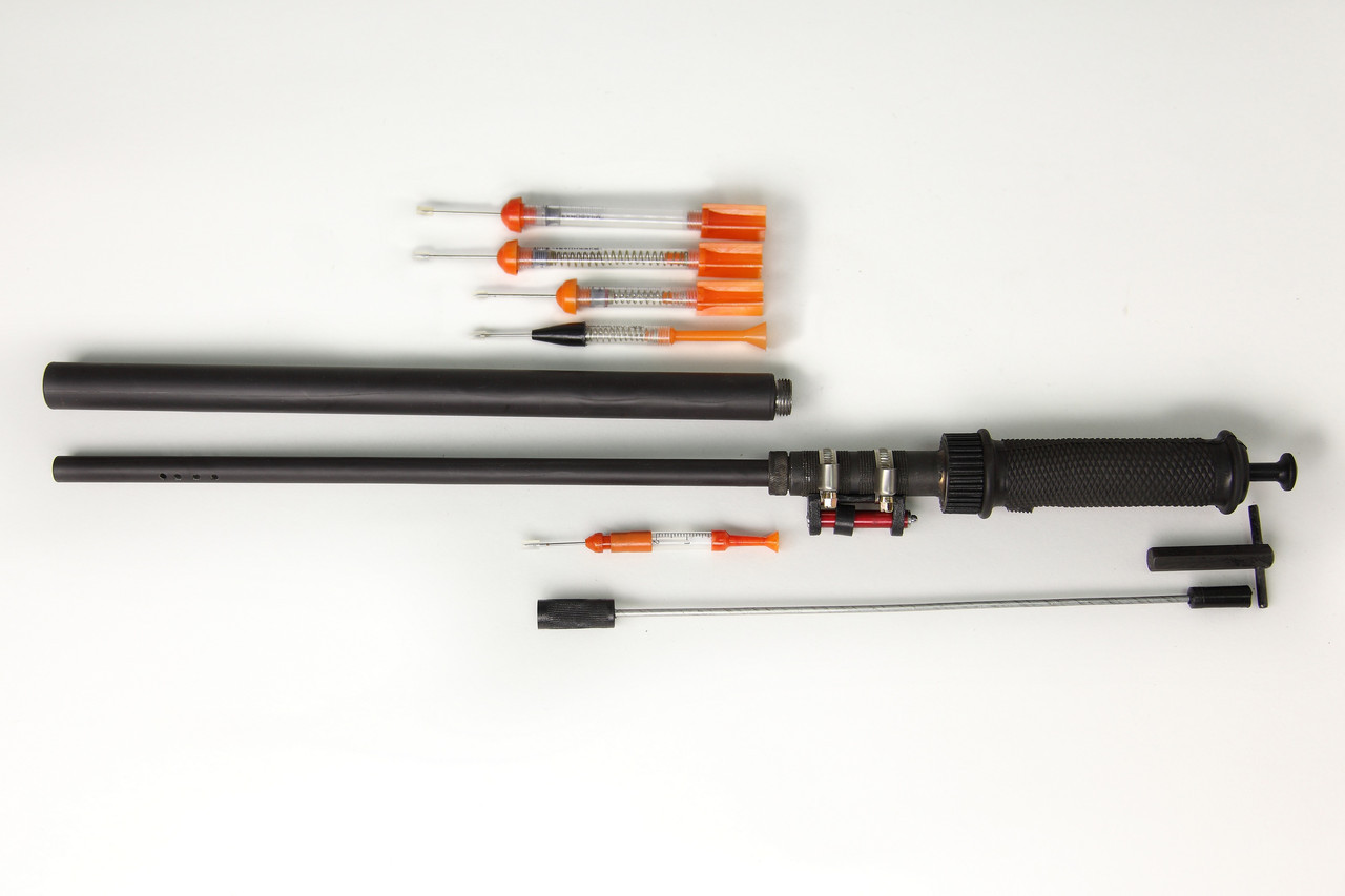 Комплект "УВыШ-пкв" состоит из пневматического метательного устройства и набора «летающих» шприцев и предназначен для введения фармакологических препаратов животным на небольших расстояниях (от 1 до 5 м). Фармакологический препарат, заправляемый в шприц, должен быть в виде раствора. Пневматический метатель укомплектован двумя стволами калибра 12 мм и 21 мм. Конструкция шприца обеспечивает его срабатывание после попадания в мышцы животного. "Летающий" шприц (изделие "ШИЛО") многоразового использования-до 10 - 15 раз. Комплектация шприцами по желанию заказчика: калибра 12 мм самовзводящиеся : емкостью 1,5 мл ("ШИЛО-1,5 с" из полипропилена) емкостью 2 мл или 4 мл ("ШИЛО-2с" или "ШИЛО-4с" из поликарбоната) калибра 21 мм пружинные : емкостью 1,5 мл или 2 мл или 4 мл ("ШИЛО-1,5п" или "ШИЛО-2п" или "ШИЛО-4п" из поликарбоната) Данная продукция ветеринарного назначения и обязательной сертификации не подлежит. Гарантийные сроки на продукцию составляют 12 месяцев. Подробнее: https://tehnofarm.com/p218339974-pnevmaticheskij-metatel-letayuschie.html